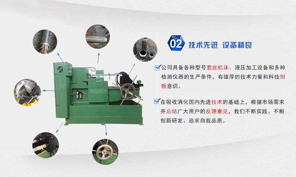 本套絲設(shè)備屬于無削加工設(shè)備,運(yùn)用特殊的切削技術(shù),上絲輕盈快捷,提高生產(chǎn)效率,采用三點(diǎn)一線,同心度高,性能穩(wěn)定等優(yōu)點(diǎn),本機(jī)每分鐘可切削3-5根工件,速度快,效率高,對(duì)于一些不定長度的鋼結(jié)構(gòu)公司,橋梁工程,電力設(shè)施等大企業(yè)的批量生產(chǎn)之需要。